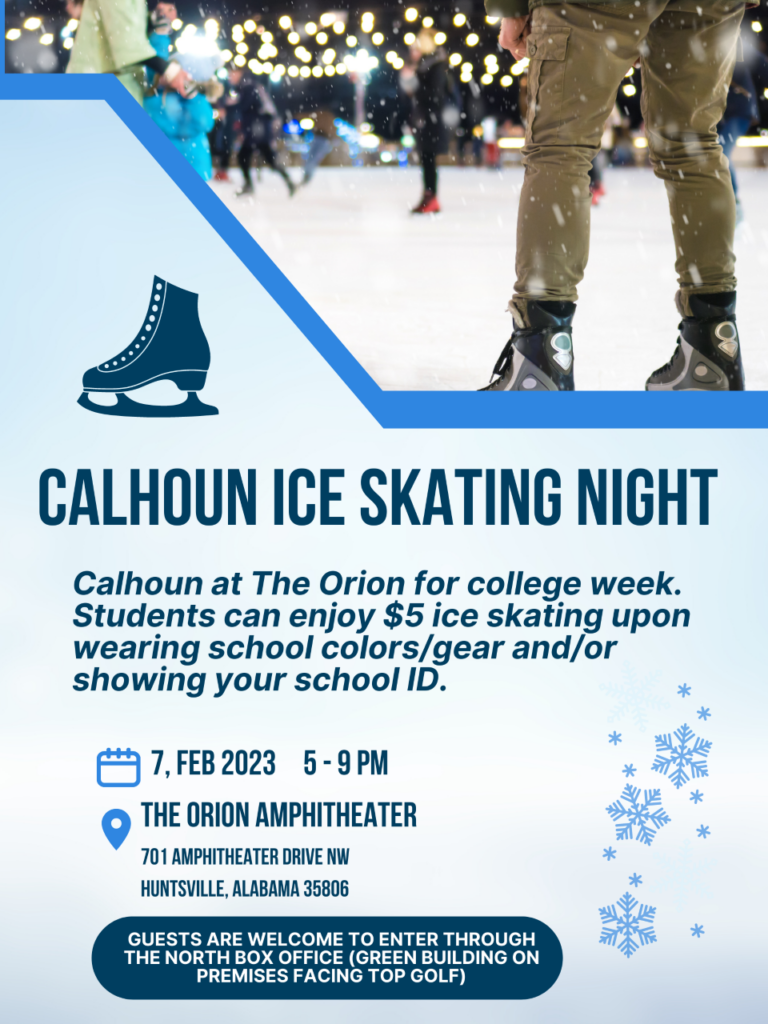 Students wearing school colors and/or gear can enjoy a night of skating for only $5. For those Warhawks who don’t have Calhoun apparel, no worries. Your school ID will get you in with this same discount.