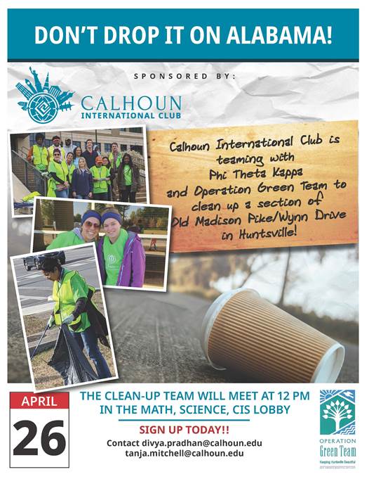 Calhoun students are invited to join a clean up day sponsored by the Calhoun International Club, Phi Theta Kappa, and Operation Green Team.