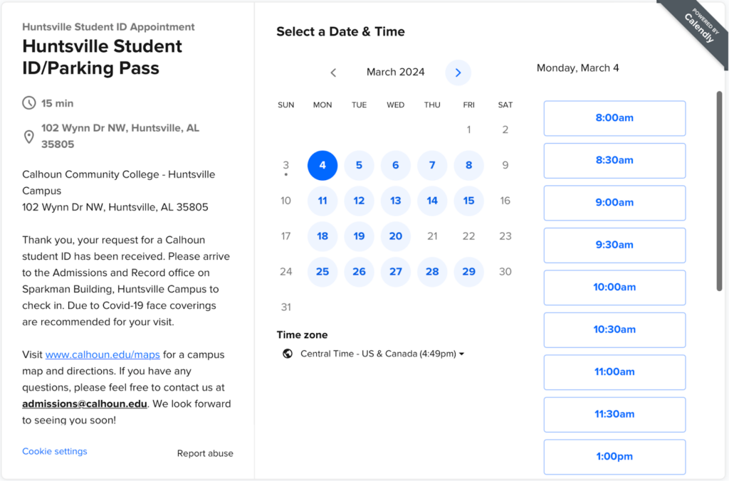All you will need to bring to your appointment is some form of official photo ID, such as a driver’s license or passport. If you don’t have a driver’s license, or aren’t sure what constitutes an acceptable photo ID, you can contact james.burton@calhoun.edu with any questions about the application process.