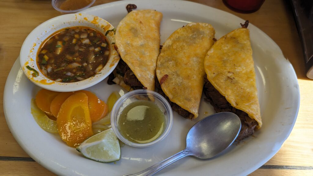 Birria: The birria tacos are delicious and are a separate menu item from the other tacos. Birria is traditionally either lamb or goat, but most restaurants in the United States, including this one, serve it with beef. The birria tacos are served with consome which is, to put it simply, an overseasoned broth that you dip the tacos in. These tacos are served in sets of three and are larger than the regular tacos. The birria tacos are shallow fried in the fat skimmed off of the consome which season the tortillas for extra flavor.