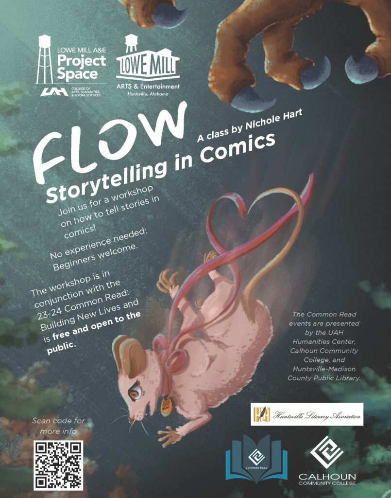 Lowe Mill hosted a workshop titled “Flow: Storytelling in Comics” with UAH lecturer Nichole Hart on Saturday, November 11. All ages and skill levels were welcome, and the primary goal was to learn about the process of developing comics in the professional world. The exercise was writing and illustrating a brief story from our own lives, inspired by the Common Read book, Thi Bui’s The Best We Could Do.